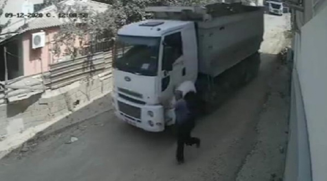 Sürücü, yokuş aşağı ilerleyen kamyona binmeye çalıştı. Hızlanan kamyon, bir binaya çarparak durabildi. O sırada yol ve kamyonun çarptığı bina boştu.