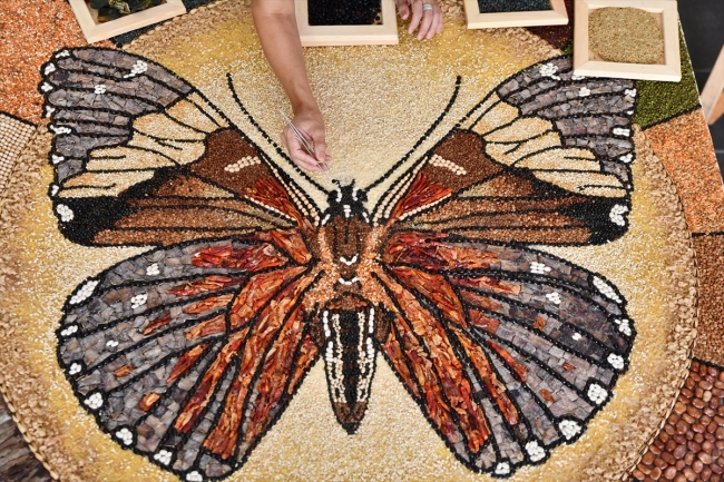 Sökücü, bakliyatlar, Antep fıstığı ve bazı kurutmalık gıdaların da arasında yer aldığı yaklaşık 50 çeşit yöresel ürünle "Kelebek Etkisi" adını verdiği eseri tamamladı.