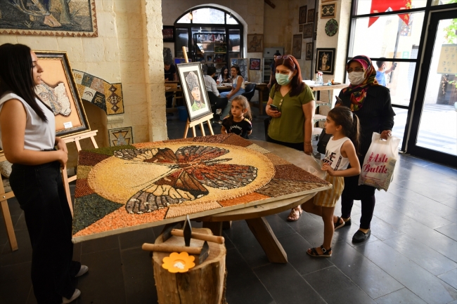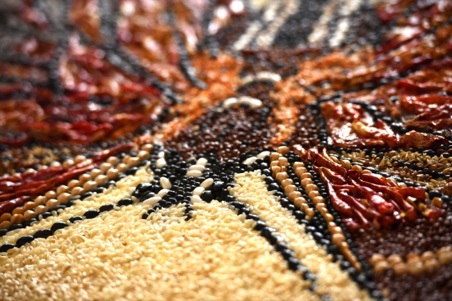 Taşlarla patlıcan kebabı, lahmacun ve yuvarlama gibi kentin yöresel lezzetlerini mozaik sanatıyla buluşturan Sökücü, taş yerine yöresel ürünleri kullanarak da eserler yapıyor.