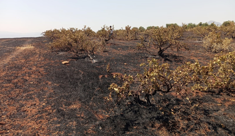 İlçe merkezine 12 kilometre uzaklıkta Şahmaran Mahallesi kırsalında dün akşam saatlerinde anızların tutuşmasıyla başlayan yangın rüzgârın etkisiyle kısa sürede büyüyerek yakındaki zeytin bahçesi ve üzüm bağlarına sıçradı.
