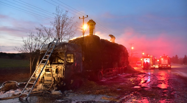 Yangında yaklaşık 20 ton saman yandı, tır ise kullanılamaz hale geldi.