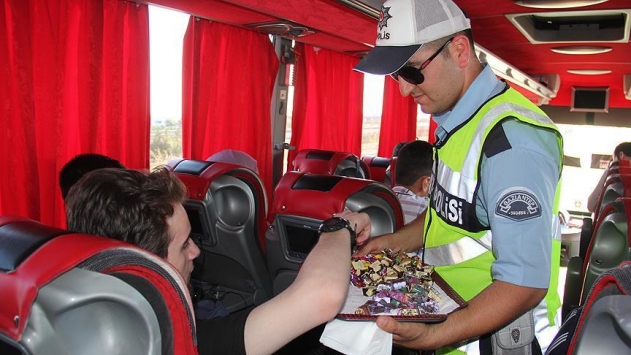 Durdurulan yolcu otobüslerine binen polis ekipleri yolcuların bayramını kutlayarak onlara şeker ve kolonya ikram etti, çocuklara ise oyuncak verdi.