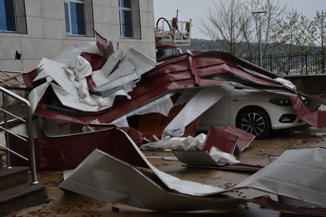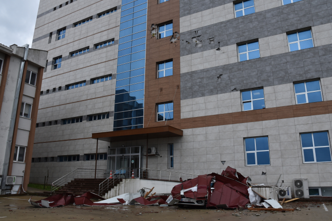 İlçede akşam saatlerinde başlayan ve gece etkisini artıran fırtına nedeniyle Bozcaali Mahallesi'ndeki Op. Dr. Ergun Özdemir Devlet Hastanesi'nin çatısının bir bölümü koptu.