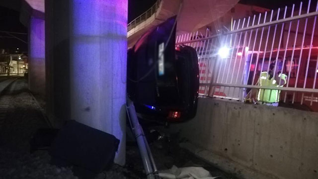 Demir korkuluklara çarptıktan sonra düştüğü belirlenen hafif ticari araç, viyadük ayağı ile demir parmaklıklar arasına sıkıştı.