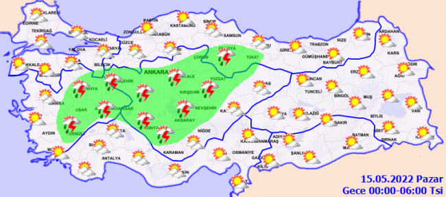 Marmara'nın güneydoğusu, İç Ege, İç Anadolu, Batı ve Orta Karadeniz’in iç kesimleri, Burdur, Antalya'nın iç batı ilçeleri, Kars, Ardahan, Hatay, Gaziantep ve Kilis çevrelerinde aralıklı sağanak ve gök gürültülü sağanak yağışlı, diğer yerlerin az bulutlu ve açık geçeceği tahmin ediliyor.