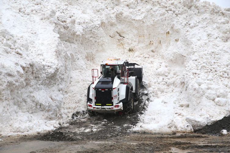 Yaklaşık 10 metrelik kar yığınının bulunduğu yolun iki tarafında da çok sayıda aracın beklediği görüldü.