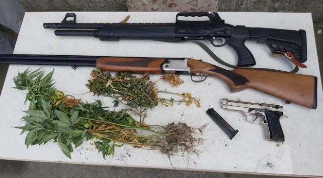 Adrese operasyon düzenleyen polis, 12 kök Hint keneviri, 36,70 gram esrar, 2 av tüfeği ile kuru sıkı tabanca ele geçirdi.