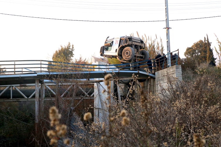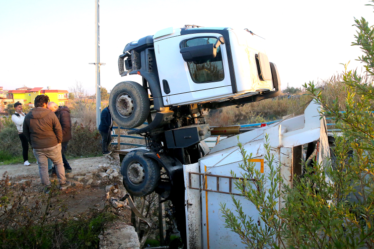 Çökme sonucu hafriyat kamyonu dereye düştü.