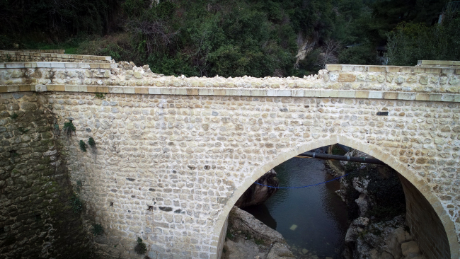 Kahramanmaraş merkezli depremlerin hafif hasar verdiği köprünün bir kısmı, merkez üssü Defne ilçesi olan 6,4 büyüklüğündeki sarsıntıda yamaçtan düşen kayalar nedeniyle yıkıldı.