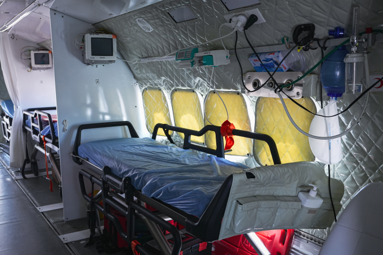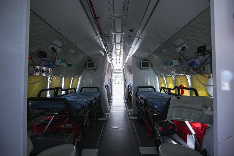 Bir yoğun bakım ünitesinde yer alması gereken elektroşok cihazı gibi tüm donanımları üzerinde barındıran ve 6 hasta taşıma sedyesinin bulunduğu uçakta, her sedyenin başında ise hasta izleme monitörü, infüzyon pompası ve mekanik ventilatör yer alıyor.