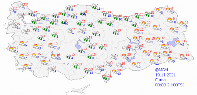 Meteoroloji Genel Müdürlüğünden alınan tahminlere göre, yurdun genelinin parçalı ve yer yer çok bulutlu, Marmara’nın doğusu, Batı Akdeniz kıyıları, İç Anadolu, Batı ve Orta Karadeniz, Doğu Karadeniz kıyıları, Güneydoğu Anadolu'nun batısı ile Kütahya, Gümüşhane ve Malatya çevrelerinin yağışlı geçeceği tahmin ediliyor.