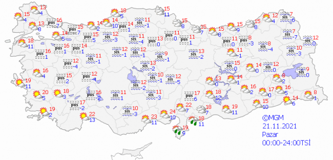 Pazar günü ise, yurt genelinde yağış beklenmiyor. İç kesimlerde sis ve pus hadisesi görülecek.