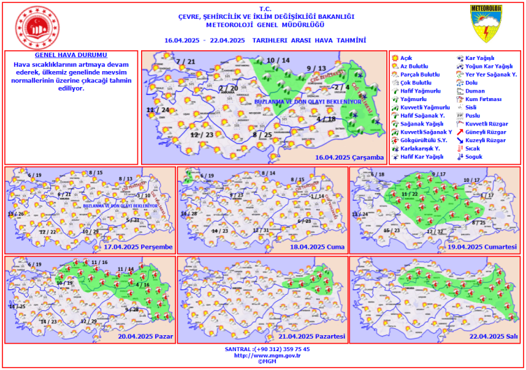 Meteoroloji Genel Müdürlüğü tarafından yapılan tahminlere göre yurdun kuzey, iç ve doğu kesimlerinin parçalı ve çok bulutlu, Orta Karadeniz (Çorum hariç), Doğu Anadolu'nun doğusu ile Sinop, Sivas, Artvin ve Siirt çevrelerinin yağışlı, diğer yerlerin az bulutlu geçeceği rahmin ediliyor.