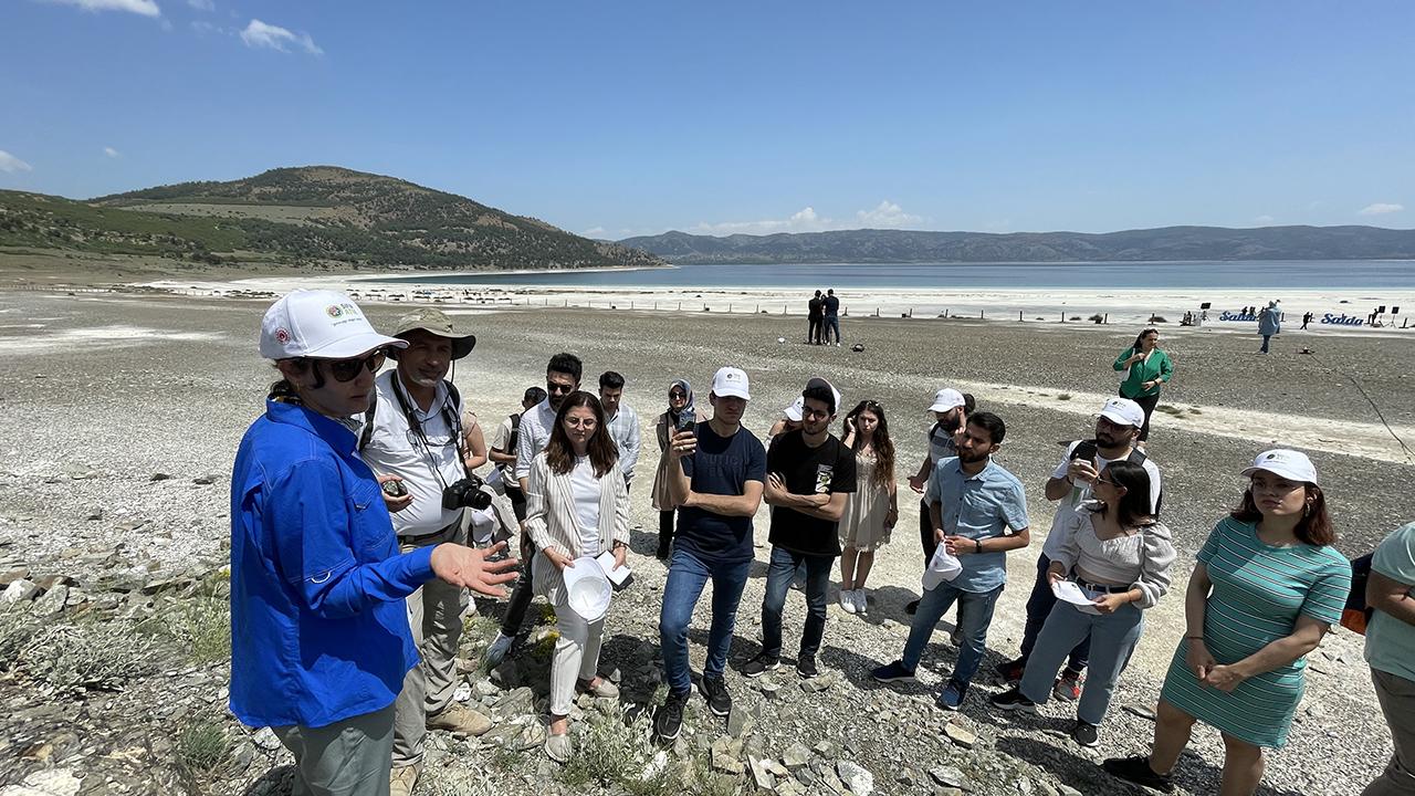 Salda Gölü çevresindeki çalışmaları yakınından takip etmek için üniversite öğrencileri, plajlarda incelemeler yaparak bilgiler aldı.