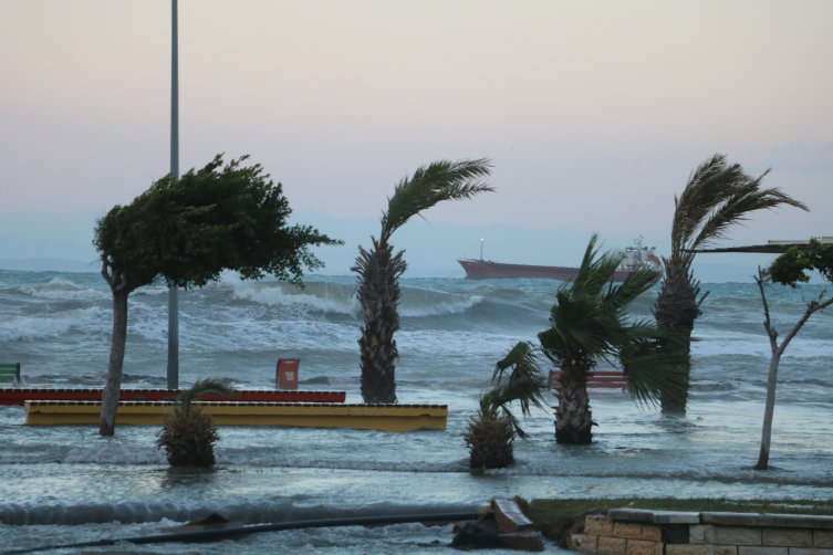 Yağış ve kuvvetli rüzgar nedeniyle deniz taşması sonucu sahil kısmındaki Anıt Meydanı ile Atatürk Bulvarı'nda su birikintileri oluştu.