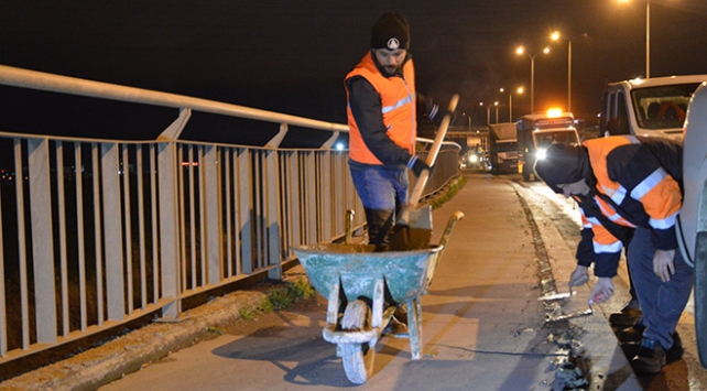 [Fotoğraf: İHA]Çatlak oluşan yerlere zift döken ekiplerin onarım çalışması sürüyor.