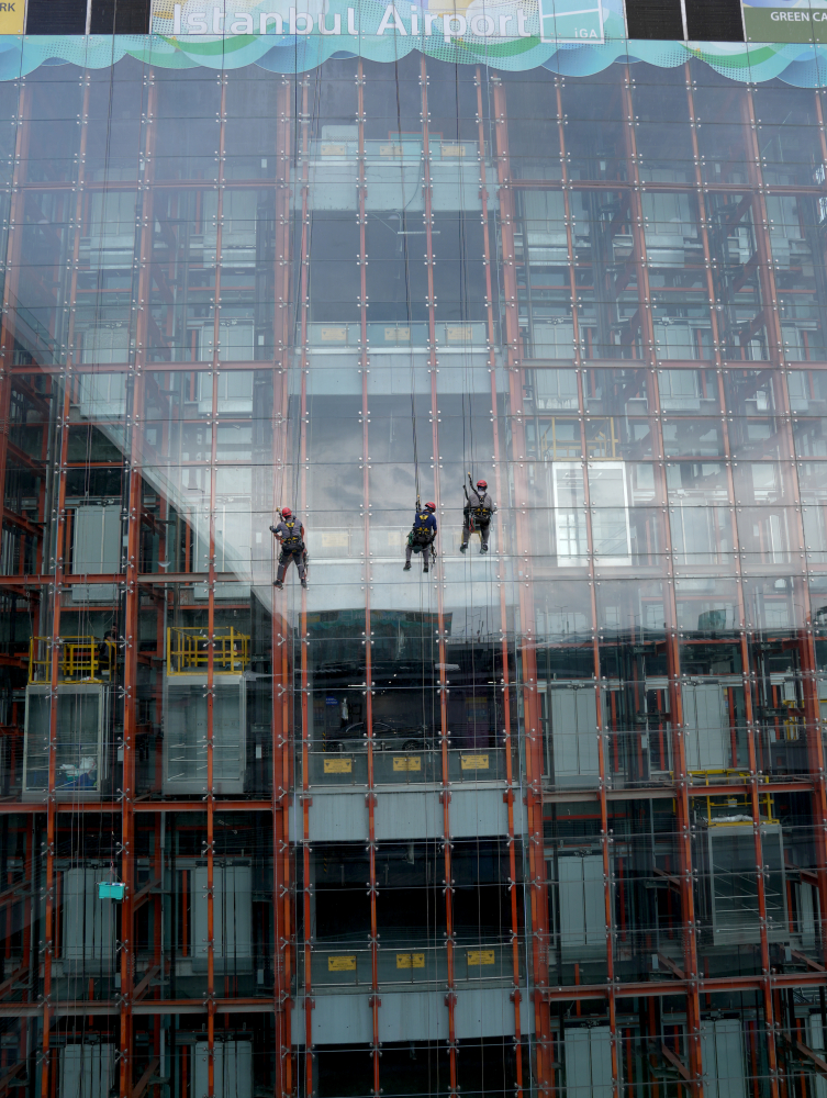 "Türkiye'de bu işler yapılmaya başlandığı zaman işe başladık. Tehlikeli bir iş ancak işinizi doğru yaparsanız yolda yürümekten daha güvenli. Bireysel bir iş değil. En az yanınızda iki kişi olmak zorunda. Çalıştığınız bölgeye bağlı olarak üstte ve altta bir-iki kişinin olması gerekiyor. Telsizle iletişimin devamlı olması lazım. Bu şekilde iş daha güvenli hale geliyor. En az iki ipimiz var. Biri çalışma biri destek ipimiz. Herhangi bir şey olduğu zaman güvenlik ipi devreye giriyor. Kullandığımız malzemelerin hepsinin belirli standartları var. O yüzden malzemeye de güvenirseniz ve işinizi doğru yaparsanız görebileceğiniz en güvenli işlerden biri. Arkadaşlarımızın hepsi İGA bünyesindeki tüm yapıların bakımlarından ve onarımlarından sorumludur. Cam temizliğinin aksine, biz burada; çatı, cephe, çelik bakım-onarımları, diğer tüm inşaat faaliyetler ile mekanik ve elektrik gibi işlere de destek veriyoruz."