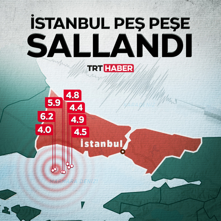 Erdoğan, şu ana kadar İstanbul'da en büyüğü 6,2 en küçüğü 3,9 şiddetindeki depremlere ilişkin Bakanlar Yerlikaya, Kurum, Memişoğlu ile İstanbul Valisi Davut Gül ve AFAD Başkanı Ali Hamza Pehlivan'ı aradı ve gelişmeler hakkında bilgi alarak çalışmalar için talimat verdi.