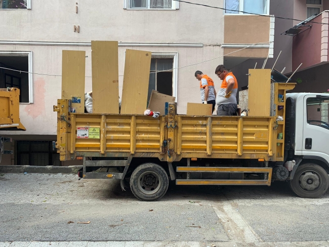 Ev sahibi ile eşinin ve çocuklarının dışarı çıkarılmasının ardından çöpler, belediye temizlik işçileri tarafından kamyonlara yüklendi.