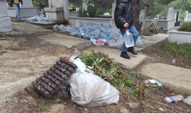 Vatandaşların mezarlardaki çiçekleri sulamak için yanlarına getirdikleri plastik su bidonları, şişe ve kapları ziyaret sonrasında çevreye bırakması nedeniyle kirli bir görüntü ortaya çıktı.