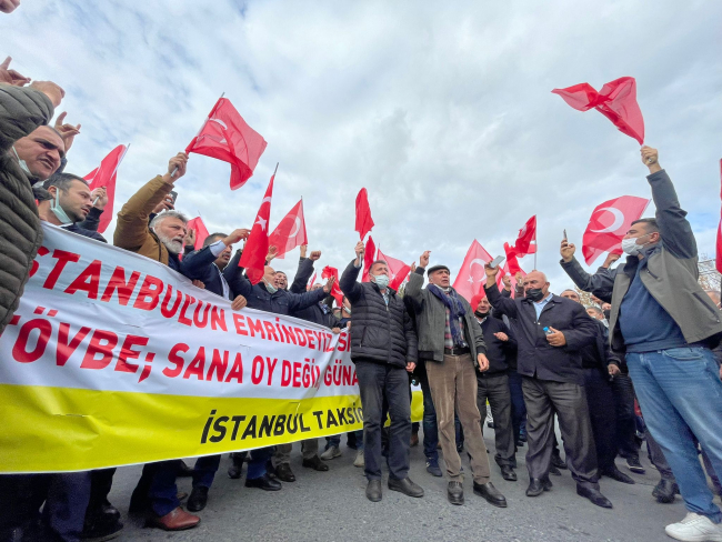 Üzerinde "Emeğe saygı, itibar suikastına son", "Esnaf sizin siyasi oyuncağınız değil" yazılı pankartlar asılan alanda toplanan taksiciler, UKOME toplantısı devam ederken dışarıda ellerinde Türk bayrakları ile eylem yaptı.
