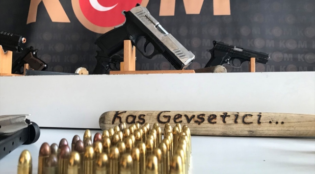 Suç örgütü üyelerinin adreslerinde yapılan aramada 7 ruhsatsız tabanca, 2 kurusıkı tabanca, 88 fişek, 50 tüfek fişeği, çeşitli ebatlarda sopa ele geçirildi.