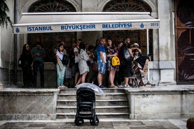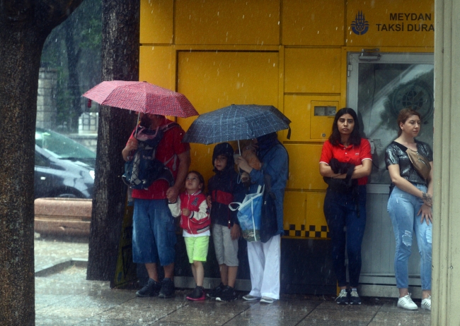 Ayasofya ve Sultanahmet'i ziyaret etmek isteyen turistler de aniden başlayan yağış nedeniyle ağaç altlarına ve çevredeki kafelere sığındı. Yağmura valizleriyle yolda yakalanan turistler, seyyar satıcılardan şemsiye satın aldı.