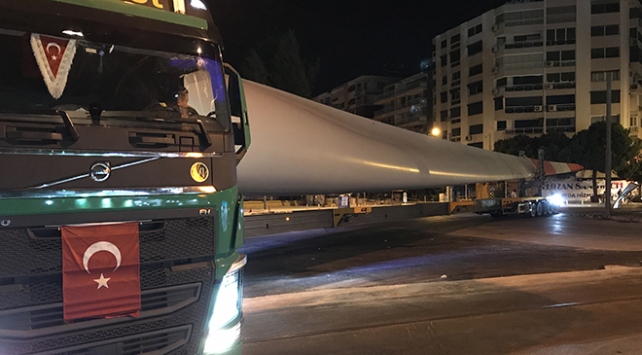 Nakliye firmasının İzmir Bölge Müdürü Levent Çağkan Özkan, gazetecilere yaptığı açıklamada, boyu 96 metre, ağırlığı ise 65 ton olan türbini gerekli izinleri alarak özellikle trafiğin yoğun olmadığı gece saatlerinde taşıdıklarını bildirdi.