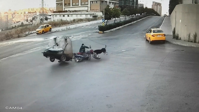 Kağıt toplayıcısı ve köpek kazayı yara almadan atlattı. Öte yandan kaza anı güvenlik kamerasına saniye saniye yansıdı.