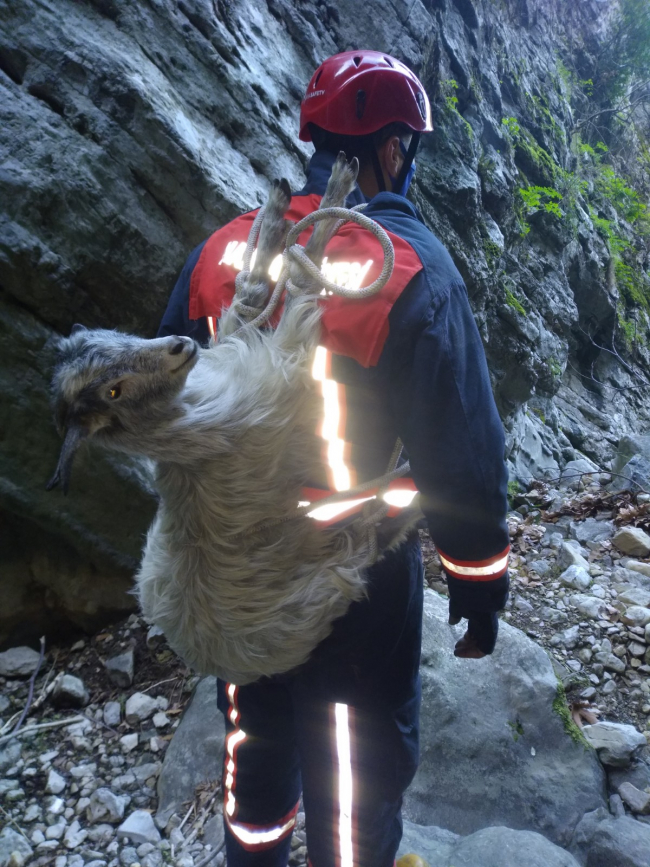 Oğlağı halatla sırtına bağlayan itfaiyeci, daha sonra merdivenle aşağı indi.