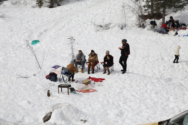 Araçlarını yol kenarlarına park ederek karla kaplı ormanlık alanda mangal yakan Adanalılar, keyifli bir gün geçiriyor.