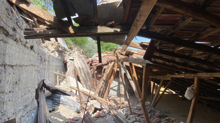 Heyelanda kopan parçalar, kimsenin bulunmadığı tek katlı bir evin çatısına zarar verdi.