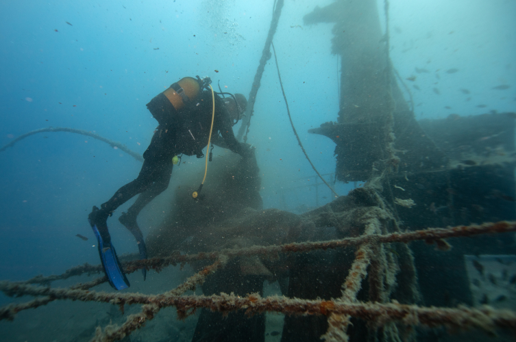Balıkçı teknelerinden atılan ancak batığa ve çevresindeki kayalıklara takılarak koptuğu tespit edilen ağları 30 metre derinliğe inerek temizleyen dalgıçlar, karaya çektikleri hayalet ağları bertaraf tesislerine gönderdi.