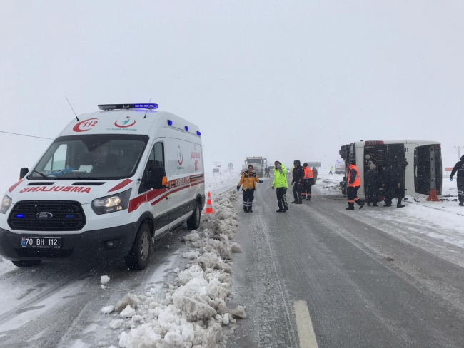 Karaman- Mersin yolunun 27'nci kilometresinde, Ankara'dan Karaman'ın Ermenek ilçesine giden Ahmet Öztürk yönetimindeki 42 DC 808 plakalı yolcu otobüsü, kar ve buzlanma nedeniyle kayganlaşan yolda kontrolden çıkıp, devrildi.