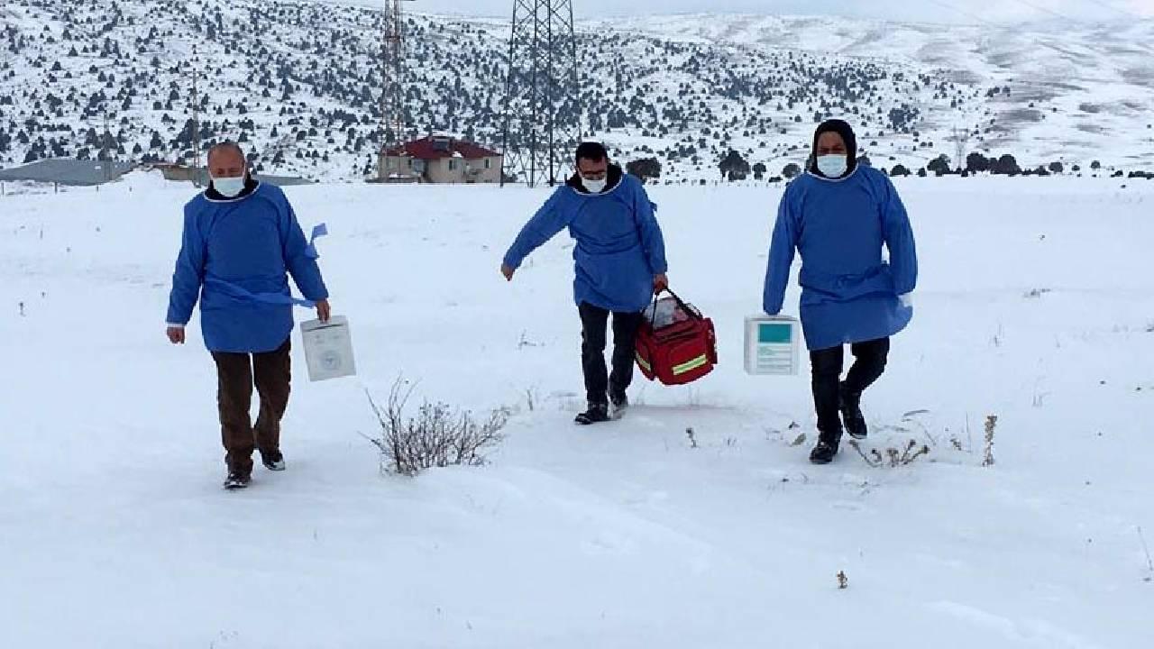 Mahalleye yakın bir yerde yine kar nedeniyle otomobille yol alamayan sağlık ekibi, Güzel Çelik'in kırsaldaki evine ulaşabilmek için yürümeye başladı.