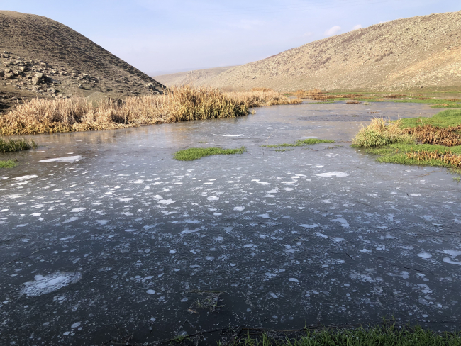 Hava sıcaklığının geceleri eksi 12’ye düştüğü Kars’ta araçların camları buz tutarken, soğuktan dereler de dondu.