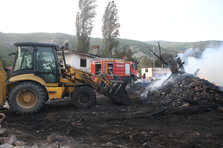 Soğutma işlemleri devam ederken, yangının çevredeki evlere sıçramaması için bir kepçe ile çalışma yürütülüyor.