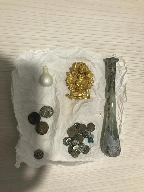 Operasyonda, Roma dönemine ait insan kafası figürü, cam sürahi, 2 adet su testisi, vazo, 20 adet sikke ve beşik figürü ele geçirildi.
