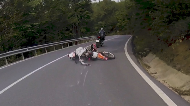 Düştükten sonra ani bir refleksle ayağa kalkan sürücü, sürüklenen motosikletin peşinden koşmaya başladı. O anlar, diğer sürücülerin kamerasına yansıdı.