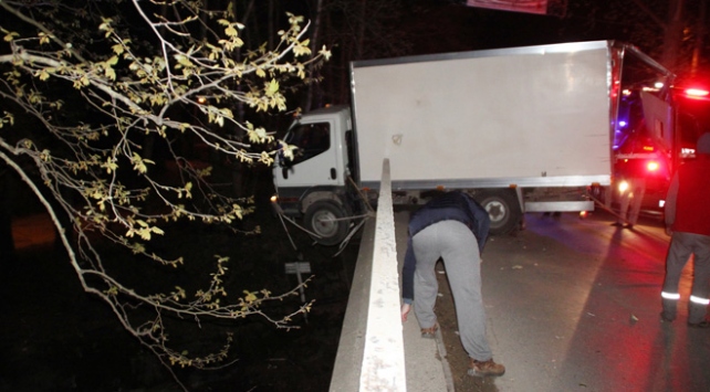Korkuluğun aracın önünden girip arkasından çıktığı kazada sürücü, ön bölümü köprüden dereye sarkan kamyonette mahsur kaldı.