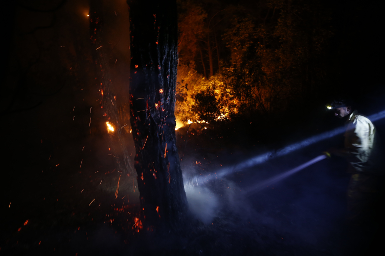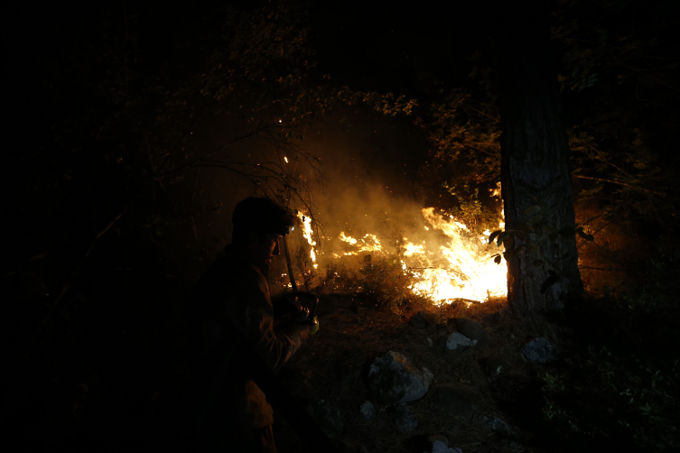 "Arazözler, iş makinalarıyla yangının başlamasından itibaren on dakika sonra müdahale edildi. Şu an itibarıyla arazinin sarp, kayalık olması münasebetiyle karadan müdahalede ciddi zorluklar yaşanıyor. İş makinaları, 50'den fazla arazöz, 300'den fazla yangın söndürmede görev alan tecrübeli iş gücümüzle müdahale edilmektedir. Rüzgarın şiddeti şu anda saatte 10 kilometre civarındadır. İnşallah sabah ışıklarıyla hava gücümüz 22 helikopter ve 10 uçakla buradaki yangına müdahale edilecek. En kısa sürede yangın kontrol altına alınacaktır. Bu saat itibarıyla takriben 60 hektar civarında bir alan, bu yangından etkilenmektedir. Yerleşim yerlerinde şu anda bir tehlike görülmemektedir. Yerleşim yerine yaklaşan bir tehlike yoktur."