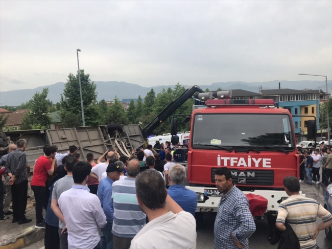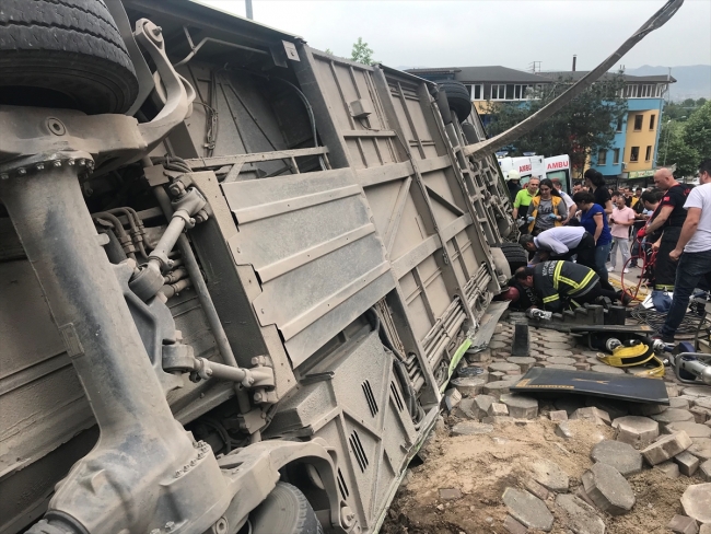 Yaralılar çevredeki hastanelere sevk edilirken, itfaiye ekipleri yan yatan otobüsün altında sıkışan bir kadın yolcuyu çıkarmak için çalışma yapıyor.