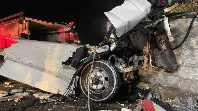 Serhat Y. idaresindeki soğuk et yüklü kamyon, Eşme Mahallesi mevkisinde yol kenarındaki istinat duvarına çarptı.