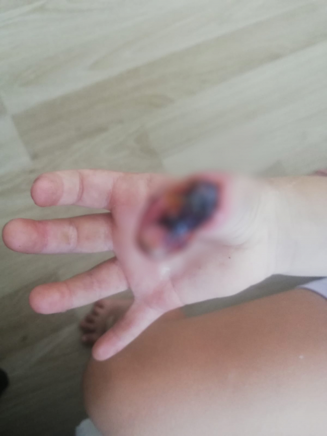 2 saat sonra kapılarını açtılar ve görebilirsiniz dediler ve gördüğümüz manzara zaten bizi orada şok etti. kızımın kolunda, baş parmağında ve orta parmağında yanıklar oluşmuştu. Yani biz kızımızı sağlam bir şekilde verdik ama yanık bir şekilde ve MR çekiminden aldık. İkinci ve üçüncü derecede yanıklar oluşmuş parmağında. Ve hiçbir şekilde hastane yönetimi bize doğru düzgün hiçbir şekilde açıklama yapmadılar. Ardından bizi odaya çıkardılar.