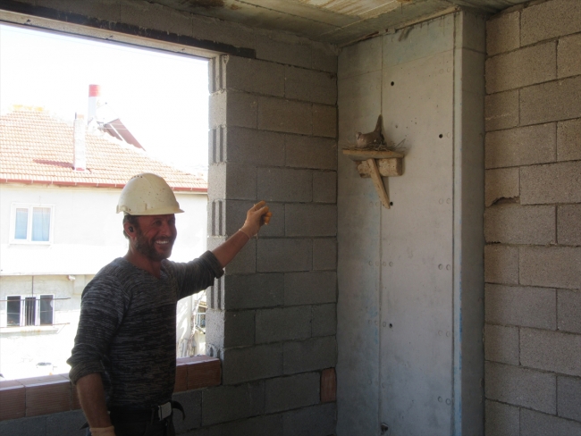 Kaba inşaatın tamamlandığını belirten Güneş, "Sıvacı bu odaya girecek ama kuşu rahatsız etmemek için girmiyor. Kumru yavrularını büyütüp uçtuktan sonra bu odanın işlemlerini de tamamlayacağız" diye konuştu.