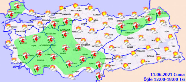 Trakya'nın batı ve kuzey kesimleri, İç Ege, Antalya ve İskenderun körfezleri ile Akdeniz Bölgesi'nin iç kesimleri, İç Anadolu'nun güney ve batısı, Doğu Karadeniz Bölgesi'nin iç kesimleri, Erzincan, Ardahan ve Bolu çevrelerinde yerel olarak sağanak ve gök gürültülü sağanak öngörülüyor.