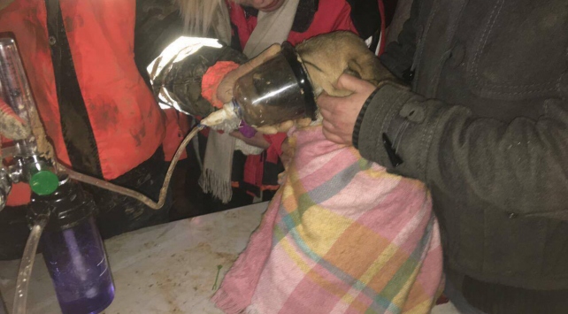 Kurtarma çalışmaları boyunca sürekli izlenen yavru köpeğe su ve yiyecek de ulaştırılmıştı.