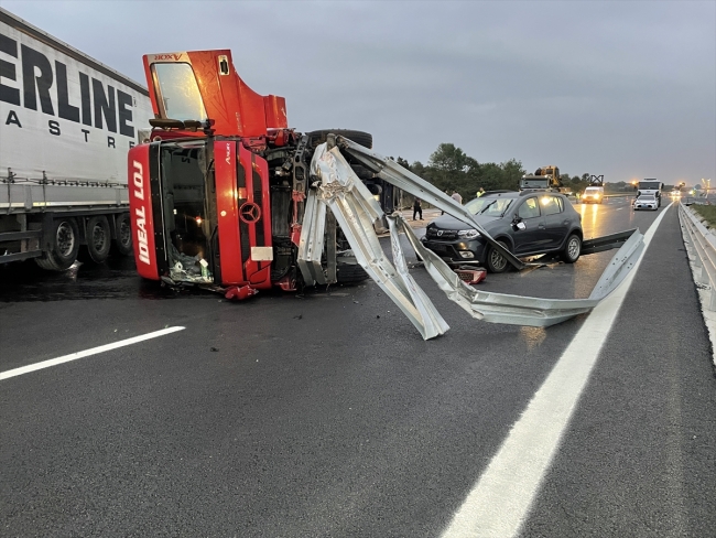 Otoyolun Karakamış mevkisi Ankara istikametinde seyreden G.D. idaresindeki 05 DT 075 plakalı tekstil yüklü kamyon, sürücüsünün direksiyon hakimiyetini kaybetmesi sonucu bariyerlere çarparak yola devrildi.