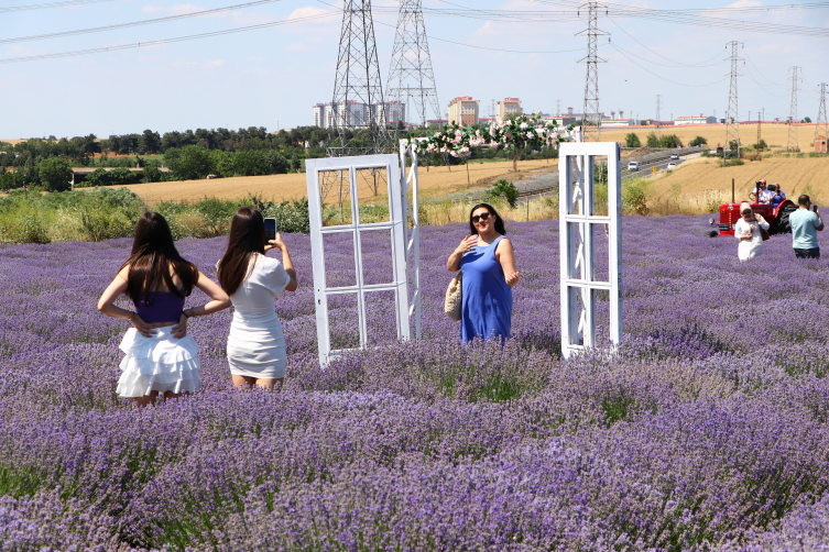 Ziyaretçiler, göz alıcı mor ve eflatun renkleriyle dikkat çeken lavanta tarlalarında oluşturulan dekorlar önünde en güzel fotoğraf karesini yakalamaya çalıştı.