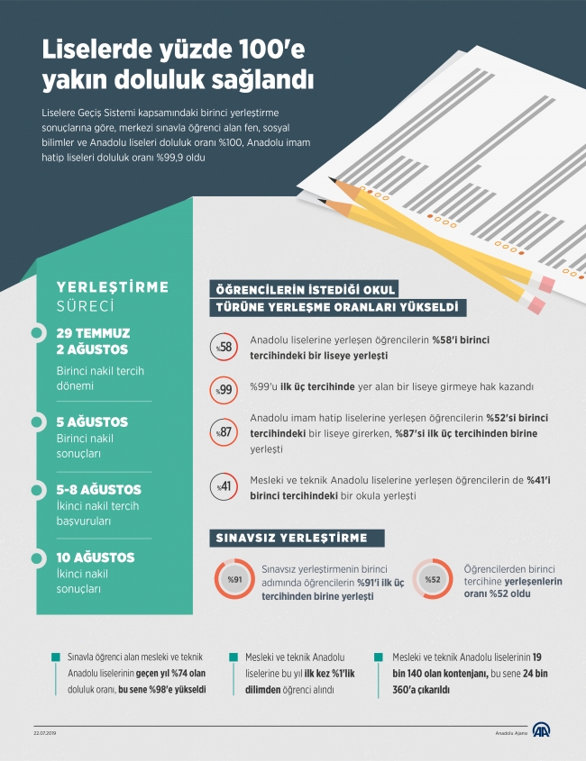 Anadolu liselerine yerleşen öğrencilerin yüzde 58'i birinci tercihindeki bir liseye yerleşirken, yüzde 99'u ilk üç tercihinde yer alan bir liseye girmeye hak kazandı.
